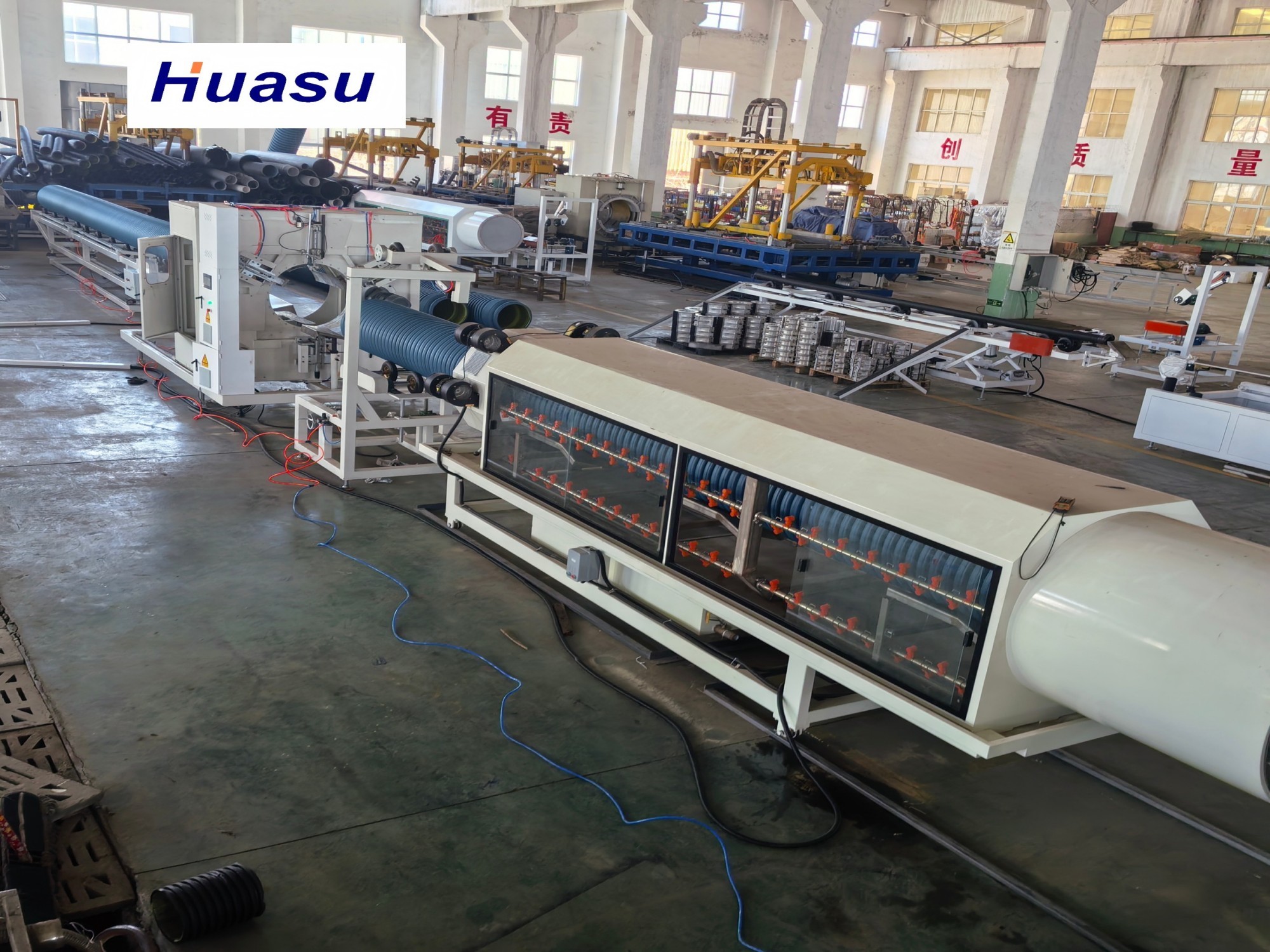 La linea per tubi corrugati è la terza generazione del prodotto migliorato di Shandong HUASU. La produzione dell'estrusore e la velocità di produzione del tubo sono notevolmente aumentate del 20-40% rispetto al prodotto precedente.