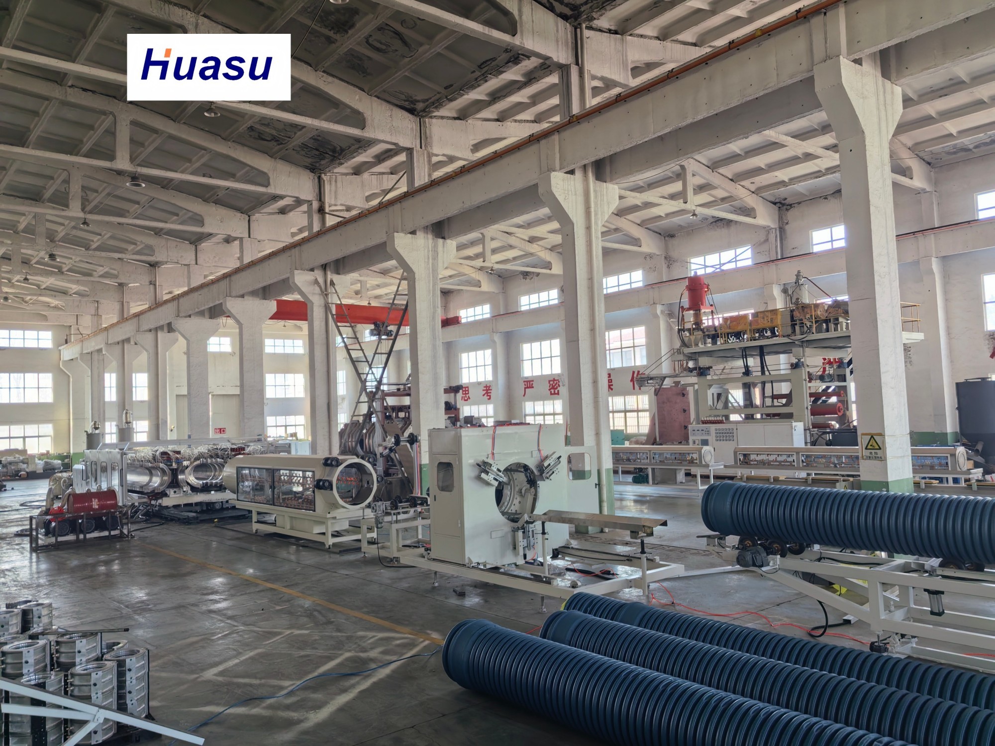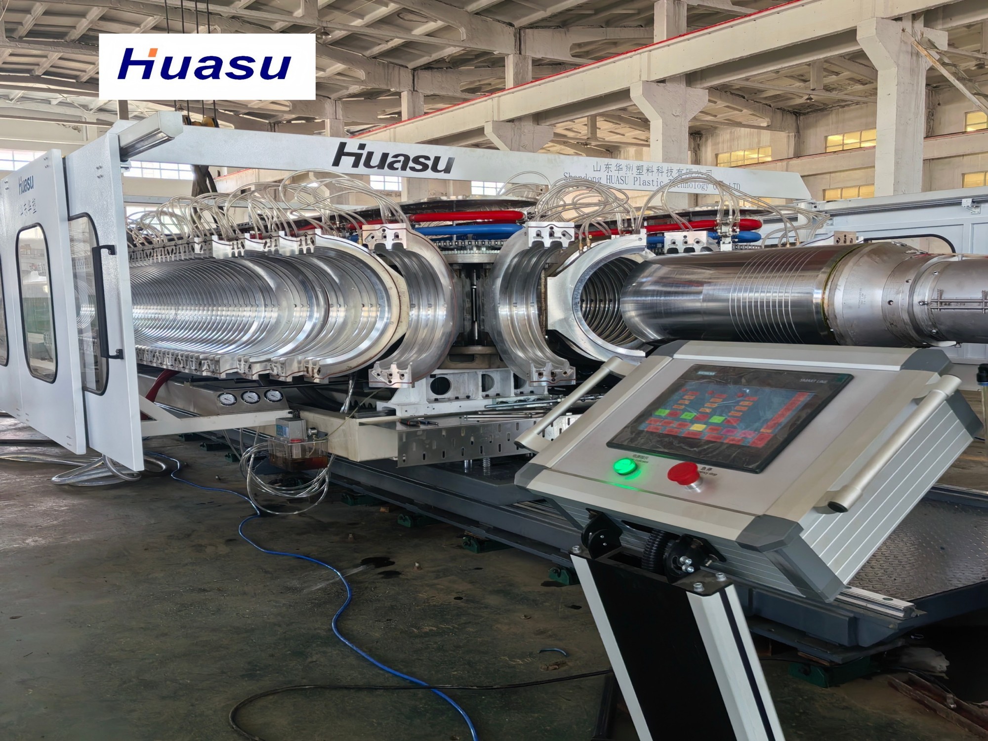 La linea di tubi ondulati è la terza generazione del prodotto migliorato di Shandong HUASU.Questo sistema avanzato ha notevolmente aumentato la potenza dell'estrusore e la velocità di produzione del tubo del 20-40% rispetto al suo predecessore.