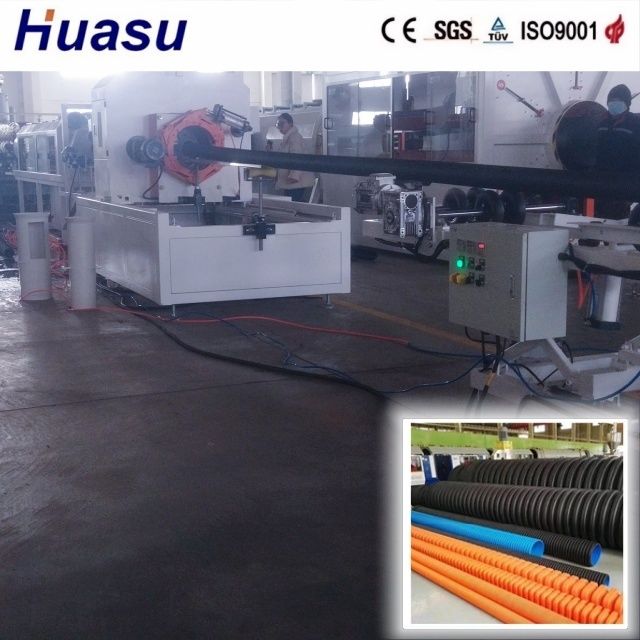 La linea di tubi corrugati a doppia parete rappresenta la 3a generazione di prodotti migliorati di Shandong HUASU, con un aumento del 20-40% della produzione dell'estrusore e della velocità di produzione rispetto ai modelli precedenti. Questo sistema consente la bordatura online per garantire prestazioni ottimali dei prodotti finiti di tubi corrugati.Utilizza il sistema di controllo PLC Siemens.